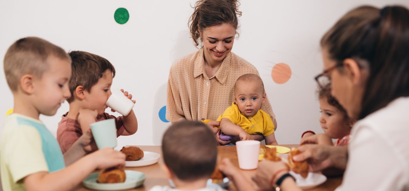Veröffentlicht 7. Dezember 2023 am 1300 × 608 in teacher and kids having breakfast in daycare.