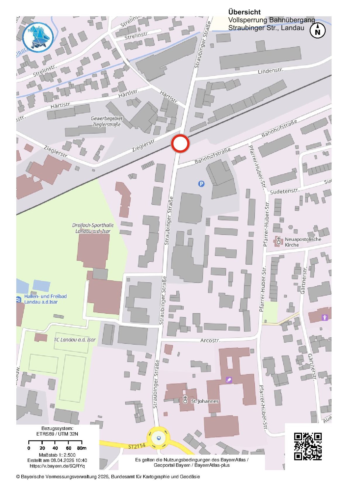 Ab Dienstag, 14.04.2026, 07.00 Uhr bis voraussichtlich Freitag, 17.04.2026, 17.00 Uhr muss der Bahnübergang Straubinger Straße in Landau a.d.Isar wegen Reparaturarbeiten an der Schrankenanlage voll gesperrt werden.